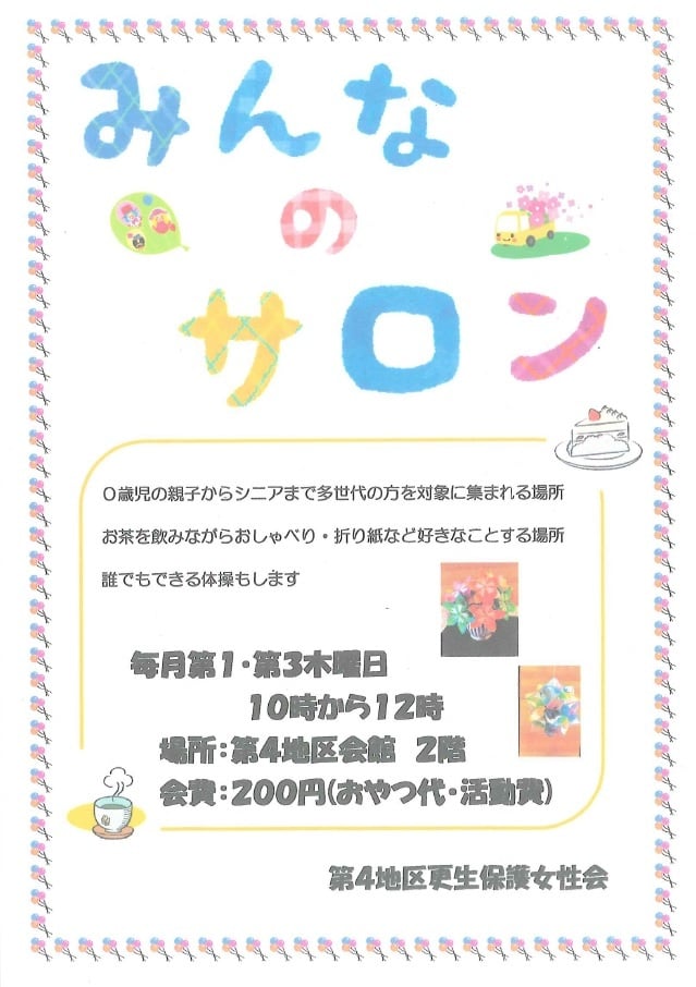 第4地区会館 みんなのサロン 2021.03.22 開催日 毎月第1・第3木曜日 時間 10:00~12:00 場所 第4地区会館 2階 (横浜市西区西戸部町1丁目116) 会費 200円(おやつ代・活動費) みんなのサロン(308KB)