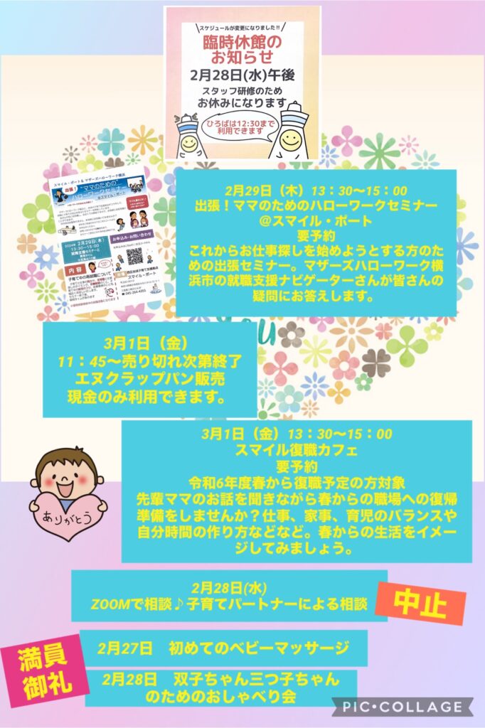 ※2月27日(火)「初めてのベビーマッサージ」2月28日(水)「双子ちゃん三つ子ちゃんイベント」は定員に達し、受付を締切りました。