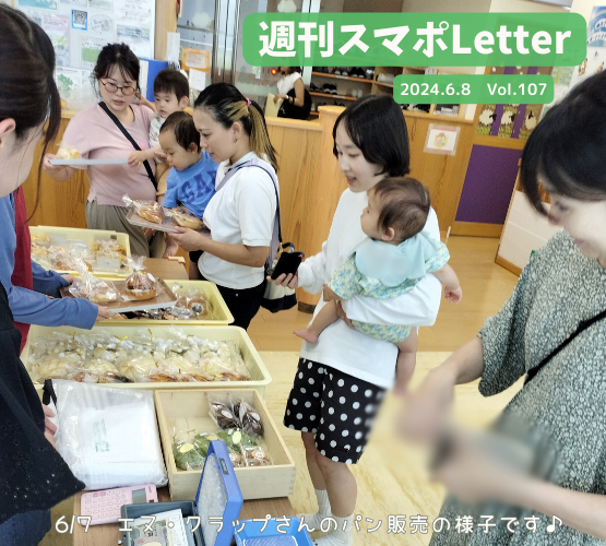 今日のトップ画像は、月イチのお楽しみ、昨日開催されたエヌ・クラップさんのパン販売の様子です。他にも今週は、「スマイルデビューday」「あつまれ!さぽーたーさん&さぽーたん!」「スマイルミライday~プレパパママタイム~」がひろばで開催されました。