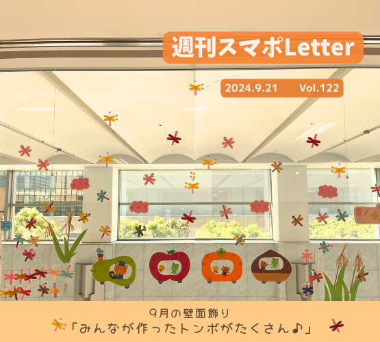 この週末を越えたら猛暑は落ち着く予報ですね。スマイル・ポートの壁面飾りもすっかり秋らしくなりました。皆さんが作ってくれたトンボがどれくらい増えるのか、これから楽しみです。