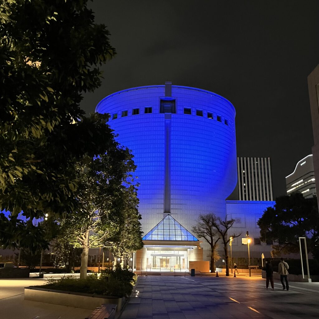 それでは最後に、夕方スマイル・ポートを出たところから見える横浜美術館のライトアップの画像をお届けします。よい週末を♪