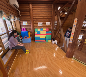 こどもログハウスというと大きいお子さん向けというイメージがありますが、あたたかい床の上でゆっくり遊べるコーナーや絵本もおいてある図書コーナー(ここもあたたかい!)など、小さなお子さんでも楽しめる場所ですよ♪
