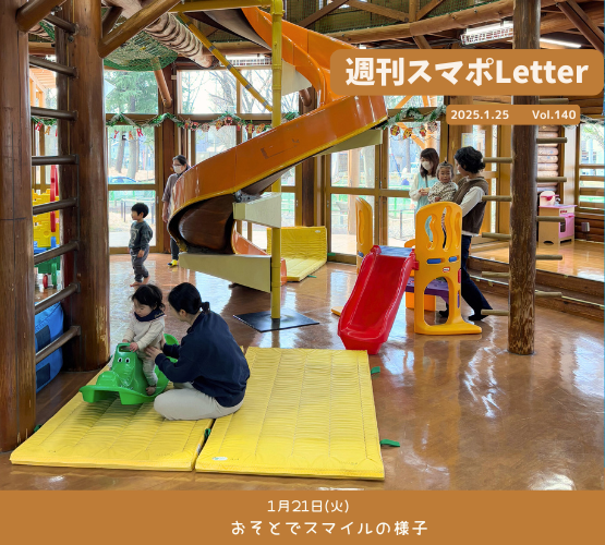 今日の画像は、21日(火)の「おそとでスマイル」の様子です。境之谷公園にスマイル・ポートの子育てパートナーも一緒にお邪魔したのですが、公園が改修工事中だったので隣接するこどもログハウスで遊びました。