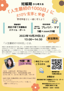 ◆10月29日(土)午後のプレパパママ向け「『人生最初の1000日』に大切な食事と栄養」ですが、出産後の方からも「参加したい!」というお声をいただいたので対象者をひろげます♪