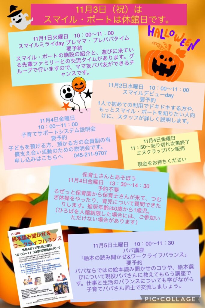 11月5日(土)は午前中事業開催のため、スマイル・ポートひろばオープンは12:30からになります。お気をつけてお越しくださいね。また11月3日(祝)も休館日です。
