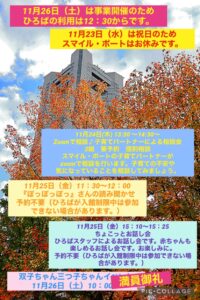 ※11月26日(土)は、事業開催のため、スマイル・ポートのひろばは12時30分からオープンします。お気をつけください。また11月23日(水)は祝日のため、お休みです。