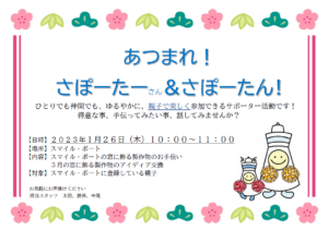 1月26日(木)は「あつまれ!さぽーたーさん&さぽーたん!」。ひとりでも仲間でも、ゆるやかに、親子で楽しく参加できるサポーター活動です。 得意な事、手伝ってみたい事、話してみませんか?