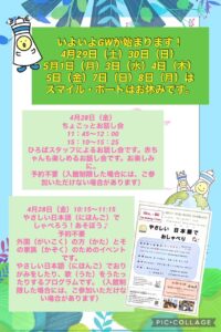 ※4月29日(土祝)から5月8日(月)の大型連休中で、スマイル・ポートが開館するのは、5月2日(火)と6日(土)です。お間違いのないように♪