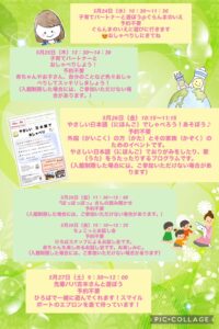 今年度は、5~6月にかけて、地域で親子で遊びにいける場所を開いている団体にスマイル・ポートに来ていただき、お昼の会や帰りの会でご紹介する企画を考えています。各々日程が決まったらインスタグラム等でお知らせします♪