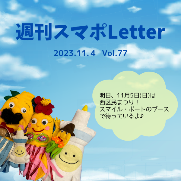 明日11月5日(日)は、西区民まつりが4年ぶりに戸部公園で開催されます。スマイル・ポートのブースは運動公園内です。地域の子育て支援の団体や保育園幼稚園情報の展示の他、いつもの手遊びや、お祭りスペシャルパラソルシアターもやりますよ。