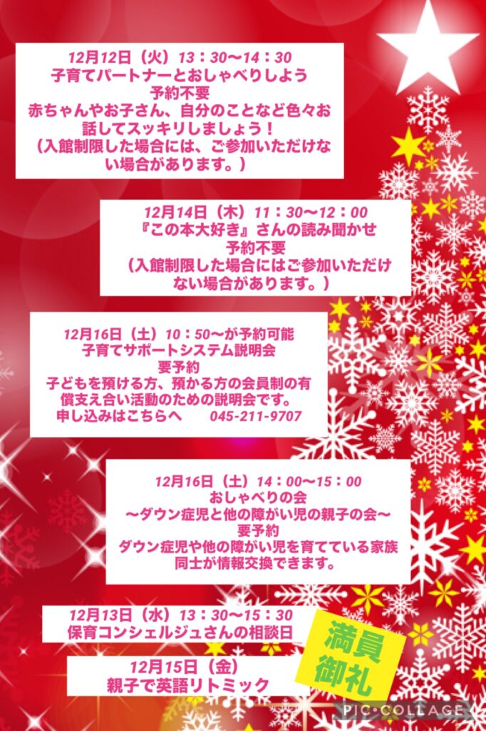 ※12月13日(水)保育・教育コンシェルジュさんの相談日 12月15日(金)親子で英語リトミックは定員に達し受付を締切りました。